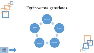 Este documento lista y brinda breves descripciones de los equipos de fútbol más ganadores de Ecuador: Barcelona, Liga de Quito, Nacional, Emelec y Universidad Católica. Proporciona detalles como las fechas de fundación de cada equipo y sus sedes principales.