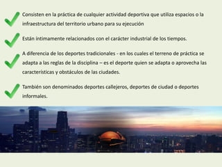 Consisten en lapráctica de cualquier actividad deportiva que utiliza espacios o la infraestructura del territorio urbano para su ejecución Están íntimamente relacionados con el carácter industrial de los tiempos. A diferencia de los deportes tradicionales - en los cuales el terreno de práctica se adapta a las reglas de la disciplina – es el deporte quien se adapta o aprovecha las características y obstáculos de las ciudades. También son denominados deportes callejeros, deportes de ciudad o deportes informales.