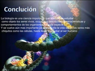 La biología es una ciencia que estudia los seres vivos, desde las células hasta los seres humanos. Describe las características y comportamientos de los organismos de cada especie, desde los más pequeños hasta los más grandes.