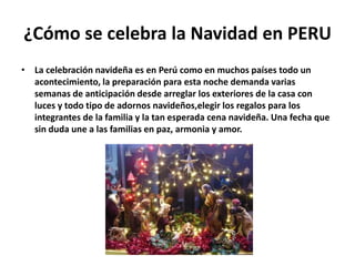 La Navidad se celebra en Perú con familias que se preparan semanas antes decorando sus casas y comprando regalos, y luego comparten una cena navideña que une a las familias en paz y amor. El documento también menciona la historia del nacimiento de Jesús, el árbol y adornos navideños, y desea a los lectores una feliz Navidad.