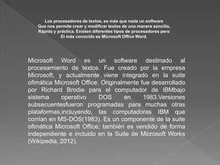 Microsoft Word es un software de procesamiento de texto creado por Microsoft que permite crear y modificar textos de manera sencilla, rápida y prática. Originalmente desarrollado para computadoras IBM bajo DOS en 1983, Word ha evolucionado para muchas plataformas y es parte integral de Microsoft Office. La interfaz de usuario de Word 2007 facilita el formato de documentos a través de características como Estilos rápidos y Temas del documento para mejorar la comunicación de contenidos.