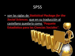 SPSS es un software estadístico utilizado para investigación de mercados. Permite recodificar variables y trabajar con bases de datos grandes. Originalmente creado para grandes computadores, la primera versión para computadoras personales fue lanzada en 1984. Hoy en día, SPSS puede ser usado por cualquier persona interesada en análisis estadísticos.