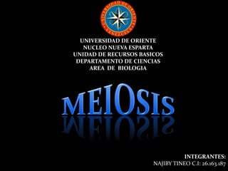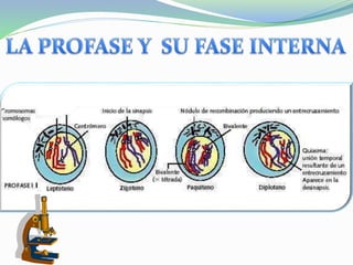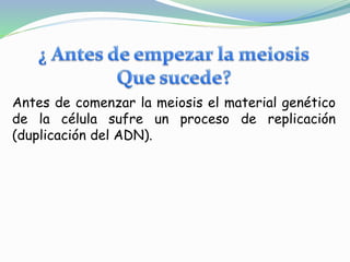 El documento describe el proceso de la meiosis, comenzando con la replicación del ADN y la desaparición del nucleolo y membrana nuclear. Durante la meiosis, los cromosomas homólogos se alinean y separan, dando lugar a dos células diploides que posteriormente se dividen en células haploides. Finalmente, el ADN se descondensa y se lleva a cabo la citocinesis.