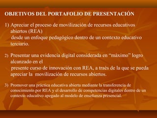 El documento describe un portafolio de presentación que detalla la movilización de recursos educativos abiertos (REA) en un contexto educativo terciario en Uruguay. Sus objetivos incluyen sensibilizar a los estudiantes sobre los REA, promover la creación y uso de tales recursos y fomentar competencias digitales para su desarrollo docente. Se presenta un plan de acción para implementar estas estrategias durante un año lectivo, evaluando su impacto a través de la participación de los estudiantes y la creación de nuevos recursos.