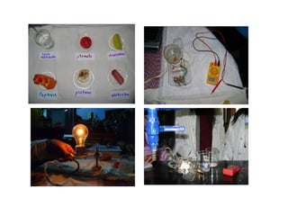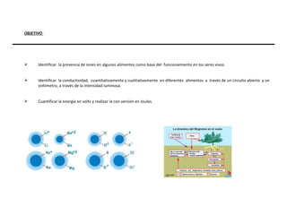 Este documento describe un experimento para identificar la presencia de iones en diferentes alimentos mediante la medición de su conductividad eléctrica usando un circuito abierto. Los resultados muestran que alimentos como la papaya, el jitomate y la salchicha conducen mejor la corriente eléctrica que otros como la manzana. El documento también convierte los valores de voltaje medidos en cada alimento a unidades de energía en Joules.