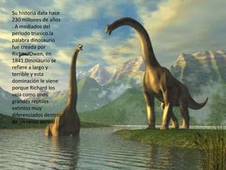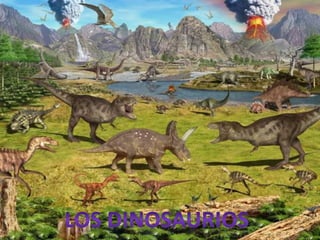 Los dinosaurios existieron hace entre 230 y 66 millones de años, dominando la Tierra durante el Triásico, Jurásico y Cretácico. Fueron los primeros en desarrollar extremidades debajo del cuerpo en lugar de los lados, lo que les permitió especializarse en la locomoción terrestre. Existían dos grandes subdivisiones de dinosaurios: aquellos clasificados por su época geológica y aquellos clasificados por la posición de su cadera.