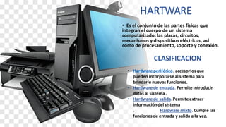 El documento describe el hardware y el software de un sistema computarizado. El hardware incluye las partes físicas como placas, circuitos y dispositivos, y se clasifica en periférico, de entrada, de salida o mixto. El software incluye los programas y lenguajes y se clasifica en sistema o básico y de aplicación.