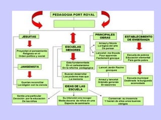 El documento describe la Abadía femenina de Port Royal fundada en 1204 que se convirtió en un centro importante del jansenismo en Francia. La abadía desarrolló trabajos pioneros sobre gramática general y atrajo a figuras intelectuales jansenistas como Saint-Cyran bajo la dirección de la madre Angélique Arnauld a mediados del siglo XVII. El jansenismo defendía una interpretación estricta de san Agustín sobre la gracia divina y la predestinación, en oposición a los jesuitas.