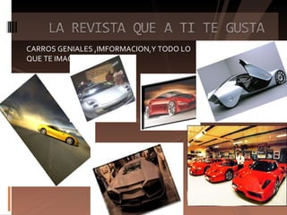 Este documento contiene información sobre varios temas relacionados con los autos, incluyendo los 9 autos más caros del 2005, características de los autos tuning como las llantas y carburadores, y conceptos sobre autos eléctricos del futuro. También incluye una revista ficticia sobre cine y celebridades.