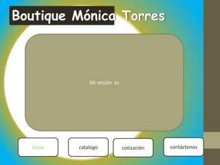 La página web de la Boutique Mónica Torres ofrece un catálogo de vestidos de diferentes colores y materiales, incluyendo un vestido rojo de gamuza con cinturón amarillo de seda y un vestido lila de microfibra de poliéster, y proporciona opciones para cotizar productos y contactar a la boutique.