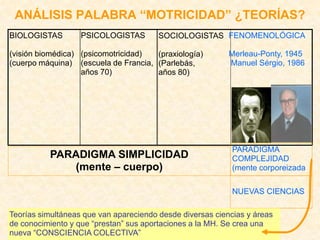 Este documento presenta una propuesta para una "otra educación física" vista desde la perspectiva de la motricidad humana. Propone una "educación corpórea" para todos que promueva la sensibilidad, la creatividad, el ludismo, la ecología y la transformación a través de prácticas lúdicas, culturales, corpóreas y dialógicas.
