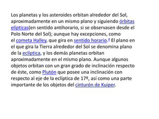 Los planetas y asteroides orbitan alrededor del Sol en un mismo plano elíptico en sentido antihorario, aunque algunos objetos como el cometa Halley giran en sentido horario. La Tierra y la mayoría de los planetas orbitan en el plano de la eclíptica, aunque Plutón y objetos del cinturón de Kuiper tienen una gran inclinación respecto a este plano.