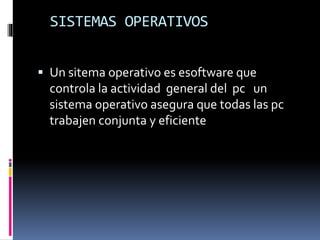 Un sistema operativo controla la actividad general de una computadora y asegura que el hardware y software trabajen de manera conjunta y eficiente. Los sistemas operativos ejecutan software, controlan hardware y proveen formas de administrar e organizar la informática. Existen diferentes tipos de sistemas operativos como Windows, Unix, Mac OS y MS-DOS, y una plataforma se refiere al sistema operativo utilizado en una computadora particular.