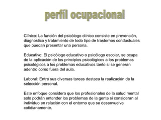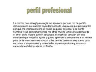 La autora expresa su pasión por la psicología porque cree que puede ayudar a entender la mente humana y sus comportamientos. Considera que tiene las habilidades necesarias como buena escucha, paciencia y comprensión de las personas para ayudar a otros como psicóloga clínica. El documento luego describe diferentes campos de la psicología como la clínica, educativa y laboral, y enfatiza la importancia de considerar al individuo en su contexto. Finalmente, define las competencias clave que los psicólogos deben desar