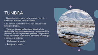 La tundra es un ecosistema frío con una capa de permafrost y vegetación baja como musgos, líquenes y arbustos enanos. La fauna incluye animales como la liebre, lobos y osos polares que se han adaptado a climas fríos con grueso pelaje. Las plantas de la tundra son perennes, formando almohadillas y rizomas para sobrevivir el invierno.