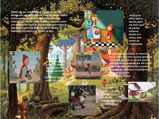 Caperucita Roja vive en un pueblo y su abuela, que ha estado enferma, vive en otro. Su madre le pide que lleve una torta y mantequilla a su abuela. En el bosque, Caperucita Roja se encuentra con un lobo que le dice que él también irá a ver a la abuela, tomando un atajo. El lobo llega primero y engaña a la abuela para entrar.