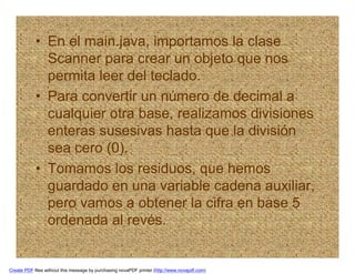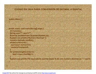 El código en Java convierte un número decimal a su equivalente en base 5 (quintal) mediante divisiones sucesivas para obtener los dígitos en orden inverso, los cuales son almacenados en una cadena y luego invertida para mostrar el número final en el orden correcto.