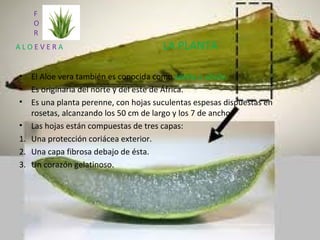 El documento describe la planta de Aloe vera, originaria del norte y este de África. Tiene hojas suculentas gruesas dispuestas en rosetas de hasta 50 cm de largo y 7 cm de ancho, compuestas por una capa exterior protectora, una capa fibrosa debajo y un corazón gelatinoso. Para cultivarla requiere temperaturas por encima de los 10°C, es resistente a plagas e insectos pero puede quemarse bajo exceso de sol o con macetas que no drenan la lluvia, por lo que