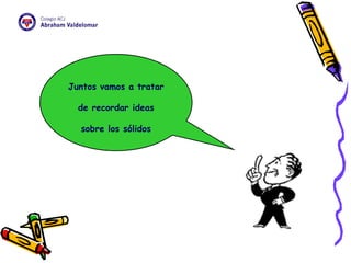 El documento trata sobre los sólidos geométricos. Explica que a partir de rectas y planos se construyen figuras tridimensionales llamadas sólidos geométricos. Los sólidos geométricos se dividen en poliedros, cuerpos redondos y sólidos de revolución. Luego describe elementos como caras, aristas y vértices de los poliedros y nombra algunos sólidos como el prisma, la pirámide, el cono y la esfera.