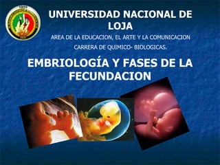 El documento resume las principales etapas del desarrollo embrionario humano desde la fecundación hasta el nacimiento. Comienza con la división celular del cigoto llamada segmentación, seguida de la gastrulación donde se forman las capas embrionarias y la organogénesis donde se desarrollan los órganos. Luego describe las tres fases del embarazo - primer, segundo y tercer trimestre - y el proceso del parto y nacimiento.