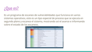Nessus es un programa de escaneo de vulnerabilidades que funciona en varios sistemas operativos y detecta vulnerabilidades en sistemas cliente, servidor y software a través de la red. Existen tres versiones principales: Nessus Professional, Nessus Cloud y Nessus Manager. Nessus funciona escaneando puertos para encontrar puertos abiertos y luego intenta varios exploits, aunque algunas pruebas pueden causar que servicios o sistemas operativos fallen.