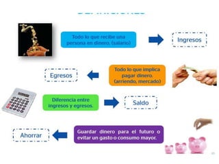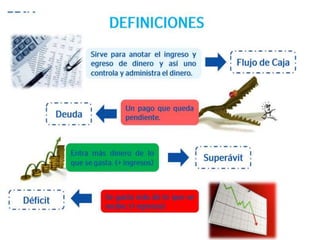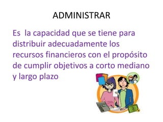 El documento habla sobre la administración de recursos financieros para cumplir objetivos a corto, mediano y largo plazo. Incluye una tabla de flujo de caja mensual con egresos como insumos, publicidad y los ingresos de ventas, así como el flujo neto calculado como la diferencia entre ingresos y egresos. Finalmente menciona una actividad a desarrollar.