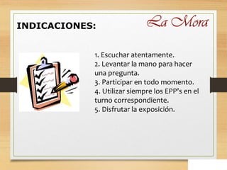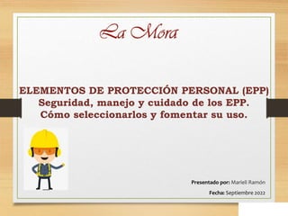 El documento presenta información sobre los elementos de protección personal (EPP), incluyendo su definición, tipos de EPP, obligaciones de empleadores y empleados, y recomendaciones para su selección, uso, mantenimiento y cuidado. Los objetivos son conocer y seleccionar correctamente los EPP, identificar los riesgos en el lugar de trabajo, y ayudar en el entrenamiento sobre el uso apropiado de los EPP.