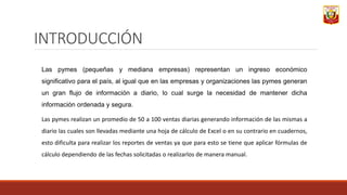 El documento propone implementar un sistema de inventario para pymes que venden productos en línea. Actualmente estas pymes llevan registros de ventas e inventarios en hojas de cálculo o cuadernos, lo que dificulta los reportes. El sistema web propuesto incluiría módulos para registrar productos, inventario, compras, proveedores y generar reportes. Esto permitiría a las pymes mejorar la gestión administrativa y el servicio a clientes.