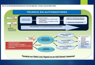 Este documento describe la estructura y contenidos de un plan de estudios técnico profesional para el sector automotriz. Explica las diferentes áreas de formación que incluyen formación general, científico-tecnológica, técnica específica y prácticas profesionalizantes, con sus respectivos contenidos en cada año. También presenta ejemplos de articulaciones curriculares entre asignaturas de diferentes años.