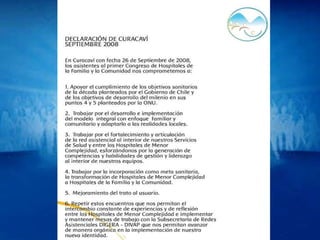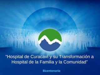 El documento describe la transformación del Hospital de Curacaví a un Hospital de la Familia y la Comunidad. Resume los principales cambios realizados como la inscripción de la población, la sectorización médica e implementación del modelo de atención primaria, y los resultados positivos obtenidos como el aumento en satisfacción de usuarios y cumplimiento de metas sanitarias. También destaca los desafíos futuros como la sustentabilidad financiera y participación ciudadana para replicar este modelo en otros hospitales.