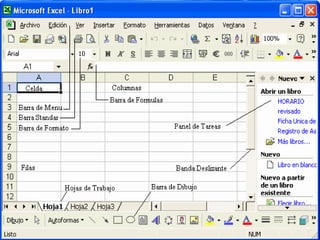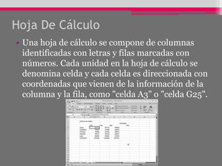 Este documento describe las características y beneficios de las hojas de cálculo electrónicas. Las hojas de cálculo se componen de filas y columnas de celdas identificadas por coordenadas. Permiten incorporar fórmulas, formateo automático y gráficos para simplificar cálculos y presentar datos de manera más clara. El software más popular es Microsoft Excel, que facilita compartir hojas de cálculo de forma rápida y segura entre usuarios.