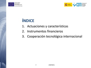 El documento describe las actuaciones y instrumentos financieros del Centro para el Desarrollo Tecnológico Industrial (CDTI) para apoyar la innovación empresarial en España. El CDTI ofrece subvenciones y préstamos para proyectos de I+D, innovación e internacionalización a través de instrumentos como proyectos de I+D, proyectos de innovación, y financiación para empresas emergentes de base tecnológica. También gestiona la participación española en programas de cooperación tecnológica internacional como Horizonte 2020.