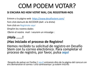 El documento anuncia la participación de 3 equipos de la escuela IES Leopoldo Querol en el concurso nacional de programación y robótica "Desafío STEM". Explica cómo los lectores pueden registrarse en el sitio web del concurso para votar por los proyectos de los equipos en cada fase del concurso, proporcionando enlaces a las páginas de los 3 proyectos. También incluye un ranking semanal de los proyectos.