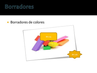 Este documento lista artículos de papelería y sus precios, incluyendo borradores de colores a $0.15-$0.20, regalas de colores a $0.25, portalápices grandes, medianos y pequeños a $0.50-$0.60, sacapuntas de figuras a $0.20-$0.30-$0.10, libretas de bolsillo para apuntes a $0.20, sellos de figura para niños a $0.35, lapiceros punta fina a $0.75-$0.35 y lápices decorados