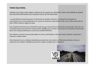 Tigris Solutions es una empresa que se especializa en el desarrollo de software industrial y la integración de sistemas de automatización. Comenzó desarrollando un software de reconocimiento de texto mediante imagen de video para Shell España y ahora ofrece una variedad de productos y servicios de control de acceso, gestión de aparcamientos, y soluciones urbanas. El documento proporciona detalles sobre los equipos, proyectos, clientes, aspectos generales y una presentación de los productos de Tigris Solutions.