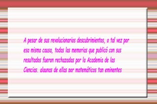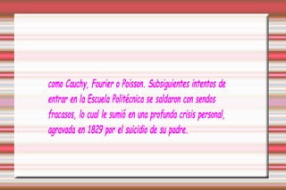 Este documento describe la vida y logros del matemático francés Évariste Galois. Galois mostró aptitudes extraordinarias para las matemáticas desde una edad temprana y desarrolló la teoría de Galois, analizando las permutaciones posibles de las raíces de una ecuación para sentar las bases de la moderna teoría de grupos.