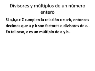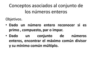 Este documento presenta conceptos fundamentales relacionados con los números enteros, incluyendo la definición de números primos, compuestos, pares e impares. También define el máximo común divisor y el mínimo común múltiplo para conjuntos de números enteros, y presenta ejemplos y ejercicios para ilustrar estos conceptos.