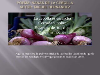 Este poema fue escrito por Miguel Hernández mientras estaba en prisión. En él, expresa el amor que siente por su hijo pequeño a pesar de la distancia, y le pide que mantenga la alegría y la inocencia de la infancia a pesar de los tiempos difíciles de guerra. También habla de cómo su familia tuvo que sobrevivir comiendo cebollas durante su ausencia.