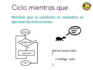 Este documento describe un ciclo que se repite mientras una condición sea verdadera. Aunque la condición sea falsa al principio del ciclo, las instrucciones del ciclo aún se ejecutarán al menos una vez antes de terminar.