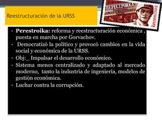 Este documento resume los principales eventos que llevaron al fin del bloque comunista. Explica que las reformas de perestroika y glasnost impulsadas por Gorbachov en la Unión Soviética buscaban solucionar problemas económicos como la baja producción y alta burocracia, pero tuvieron el efecto no deseado de aumentar el nacionalismo en las repúblicas. Luego describe cómo Polonia y Hungría aplicaron reformas democráticas en 1989, lo que permitió que ciudadanos de Alemania del Este escaparan a través de H