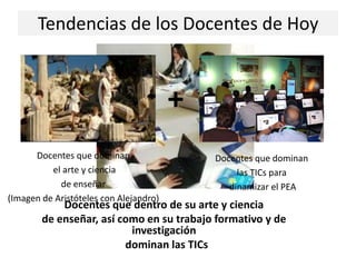Este documento discute el rol de las tecnologías de la información y la comunicación (TICs) en la docencia. Señala que los docentes deben dominar tanto el arte y la ciencia de enseñar como las TICs para dinamizar el proceso educativo. Explica que el dominio de las TICs significa usar herramientas electrónicas para ampliar el espacio de encuentro, acceder a información en cualquier momento y lugar, comunicarse de forma instantánea y ahorrar recursos. No obstante, advierte sobre la dependencia excesiva de las T