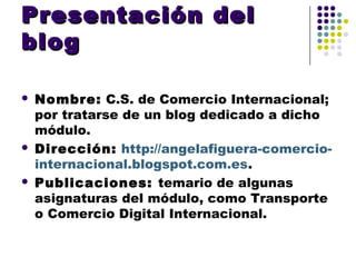 Este documento describe los pasos para crear un blog educativo sobre comercio internacional en Blogger. Explica cómo configurar el nombre, dirección URL y contenido inicial del blog, y proporciona instrucciones detalladas sobre cómo añadir páginas, publicar entradas, insertar presentaciones y configurar menús y pestañas. El objetivo final es crear un recurso en línea bien estructurado con información y recursos sobre varios temas relacionados con el comercio internacional.