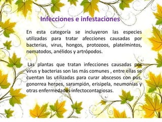 Este documento describe varias plantas utilizadas en la medicina tradicional para tratar infecciones y infestaciones causadas por bacterias, virus, hongos y otros patógenos. Algunas de las plantas discutidas incluyen nigua para tratar sarampión y viruela, izo para pulmonía y tos ferina, y paico para cólicos, resfriados y pulmonías. La mayoría de las plantas se usan como tratamientos para una variedad de afecciones a través de infusión, decocciones o aplicaciones tópicas.