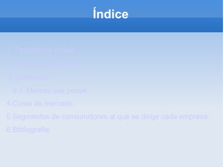 El documento resume la historia y estado actual de la telefonía móvil en España. Menciona que llegó en 1976 y ahora es ampliamente aceptada. Las principales compañías son Telefónica (Movistar), Vodafone y Orange. Telefónica es el líder del mercado con el 40.3% de cuota. Se dirige a consumidores de 8 a 100 años.