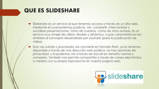 Slideshare es un servicio web que permite a usuarios publicar, ver y compartir presentaciones. Los usuarios pueden subir presentaciones en formatos como PowerPoint y PDF, las cuales son convertidas a formato flash. Esto permite que las presentaciones sean vistas y compartidas fácilmente a través de enlaces web sin necesidad de adjuntar archivos pesados. Slideshare es útil para compartir presentaciones sin problemas con otros y administrar una biblioteca en línea de presentaciones publicadas.