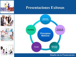 Este documento ofrece consejos para diseñar presentaciones exitosas, incluyendo organizar la información en una diapositiva por idea, utilizar plantillas y colores corporativos consistentes, y evitar imágenes oscuras o diapositivas recargadas. También recomienda estructurar las ideas en torno a preguntas como qué, quién, cuándo, cómo y dónde.