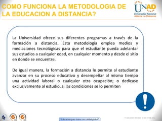 La metodología de educación a distancia de la UNAD permite a los estudiantes realizar sus estudios desde cualquier lugar y a su propio ritmo, facilitando la combinación de sus actividades laborales y académicas. El aprendizaje autónomo y autoaprendizaje son fundamentales en este contexto, promoviendo la motivación y el desarrollo de habilidades personales. El campus virtual ofrece una variedad de recursos y herramientas para soportar este tipo de educación, incluyendo contenidos didácticos, actividades interactivas y soporte técnico.