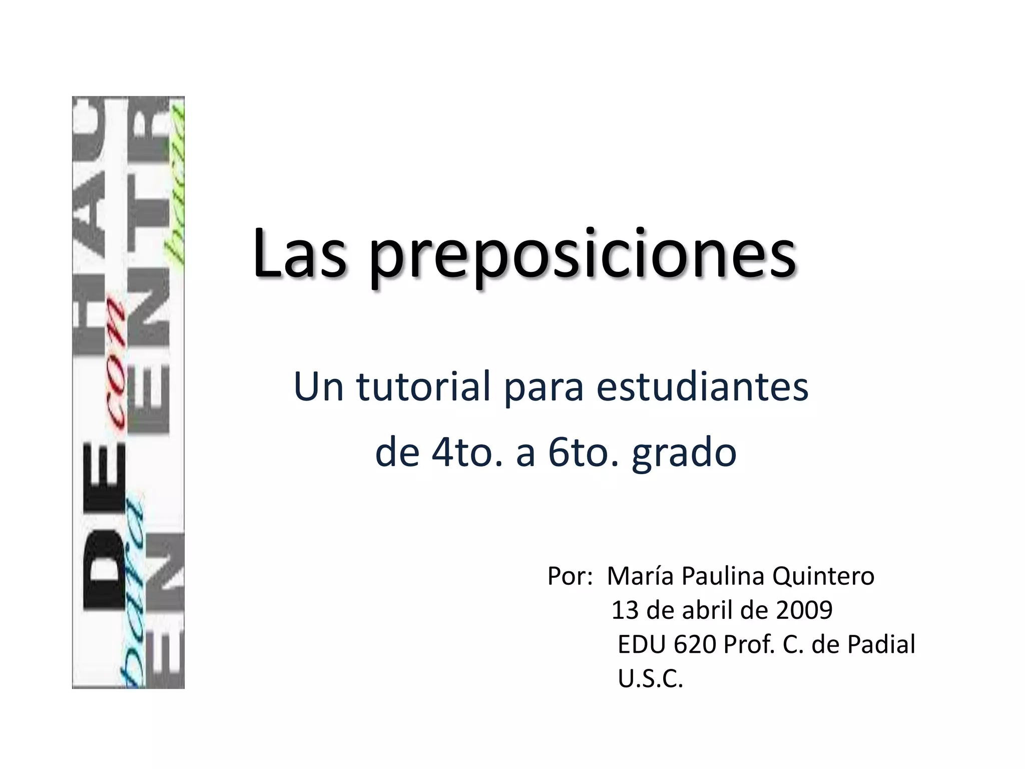 Este documento presenta un tutorial sobre las preposiciones para estudiantes de 4to. a 6to. grado. Explica que las preposiciones sirven para unir palabras, acciones e ideas relacionadas y menciona algunas preposiciones comunes como a, de, en y para. El tutorial se divide en cuatro partes donde se analizará la función, características y uso correcto de las preposiciones.