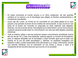 El documento presenta el Plan de Gestión de las TIC de la Institución Educativa Técnica Juan V. Padilla. El plan busca incentivar el uso pedagógico de las TIC por parte de docentes y estudiantes para mejorar la calidad educativa. Se realizó un diagnóstico que identificó fortalezas y oportunidades en el uso de las TIC. El plan propone objetivos, líneas estratégicas y acciones para capacitar al personal, rediseñar el currículo incorporando las TIC, y optimizar procesos institucionales