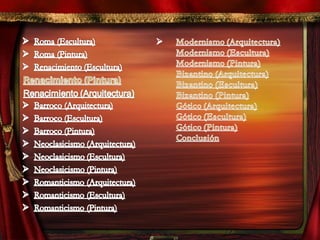 Este documento resume brevemente las características de la arquitectura, escultura y pintura de varias civilizaciones antiguas como Egipto, Grecia, Roma y del Renacimiento, Barroco, Neoclasicismo, Romanticismo, Modernismo y el arte Bizantino. Describe los principales estilos y técnicas utilizadas en cada período histórico-artístico.